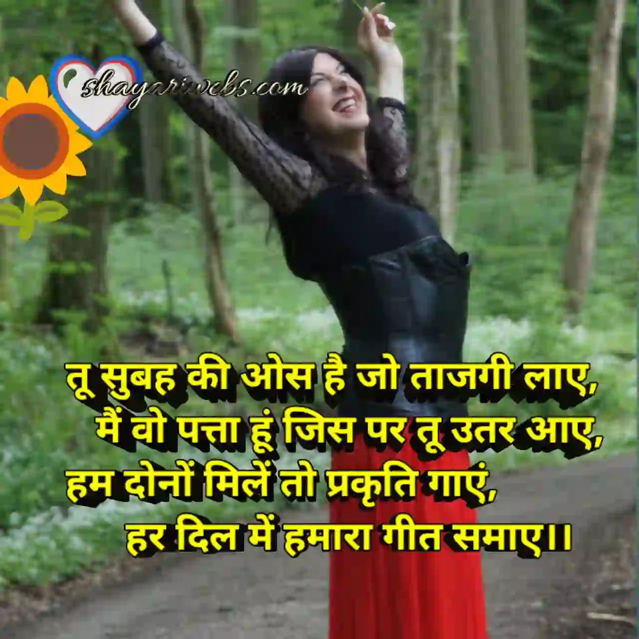 प्रकृति के हर कोने में प्रेम की गूंज होती है। पेड़ की छांव, नदी की ठंडक, हवा की मिठास – सब एक एहसास देते हैं कि प्यार में ठहराव और गहराई कितनी जरूरी है। ऐसी शायरियाँ पाठक को सिर्फ शब्द नहीं बल्कि सुकून और अपनापन देती हैं। जब आप इन भावनाओं को शेयर करते हैं, लोग खुद को उसमें देखते हैं, और यही वजह है कि वे इन पंक्तियों को आगे शेयर करने पर मजबूर हो जाते हैं।